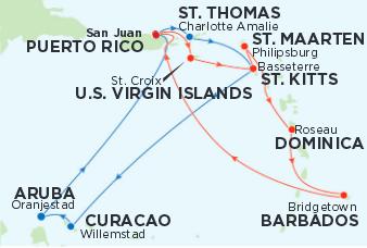 Útvonal: San Juan (Puerto Rico) - Charlotte Amalie (St. Thomas) - Basseterre (St. Kitts) - Willemstad (Curacao) - Oranjestad (Aruba) - San Juan (Puerto Rico)
