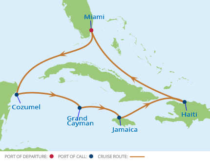 Útvonal: Miami (Florida) - Cozumel (Mexikó) - George Town (Grand Cayman) - Falmouth (Jamaica) - Labadee (Haiti) - Miami (Florida)