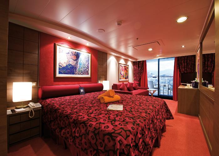 - Balkonos kabin: 809 darab, 17-23 m2, széthúzható ágyak (kivéve a mozgáskorlátozottak részére kialakítottakat), gardrób szekrény, privát balkon, francia ágy (igény esetén 2 db szimpla ágy), légkondicionáló, televízió, telefon, minibár, széf, fürdőszoba zuhanyzóval, internetezési lehetőség (térítés ellenében). Bella, Fantastica vagy Aurea szolgáltatással.