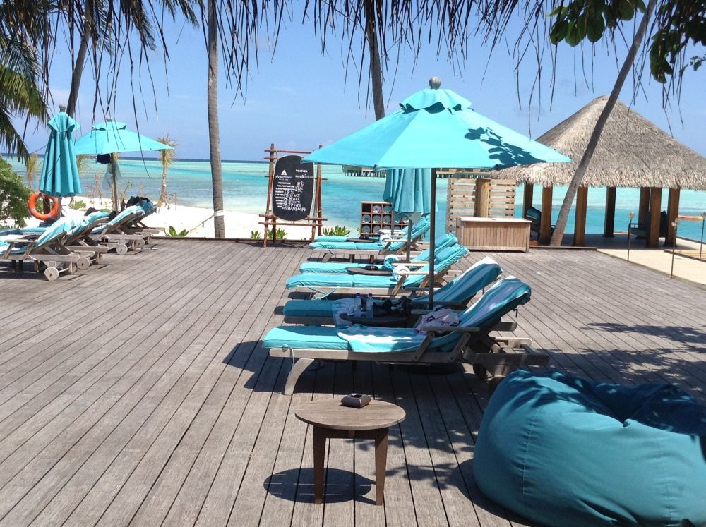 Dhoni Loft suite: közvetlen lejárat a lagúnákhoz napozóágyakkal.