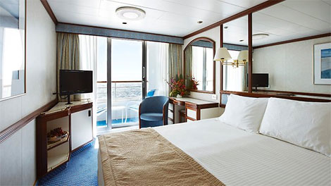 - Balkonos tengerre néző kabin: 16-17 nm - (balkonnal együtt), franciaágy, műholdas televízió, telefon, széf, hűtőszekrény, asztal, gardrób, fürdőszoba, zuhanyzó, hajszárító, balkon.